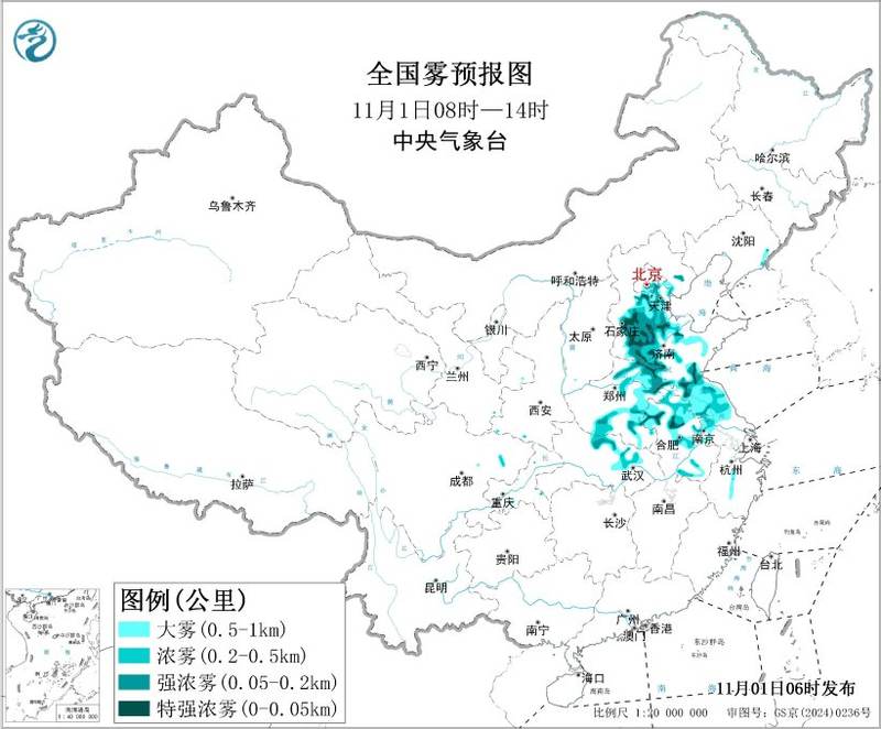新京报中央气象台11月1日早6时发布大雾橙色预警:预计11月1日上午至上午中旬,北京东南部、天津中中部、河北中南部、河南中东部、山东中南部、安徽中北部、江苏中北部、湖北中北部等地出现大雾。其中,东南部部分地区出现能见度不足500米的大雾。北京、天津西部、河北中南部、山东北部和南部、河南北部和南部、安徽中北部、江苏中北部、湖北北部等地局地特大大雾,能见度不足50米。防护指南: 1、大雾天气明显降低空气质量,影响健康,居民应做好防护。 2、由于能见度较差,驾驶员应控制车速,确保安全。 3. 机场,h公路、轮渡码头应当采取措施,确保交通安全。编辑刘嘉妮