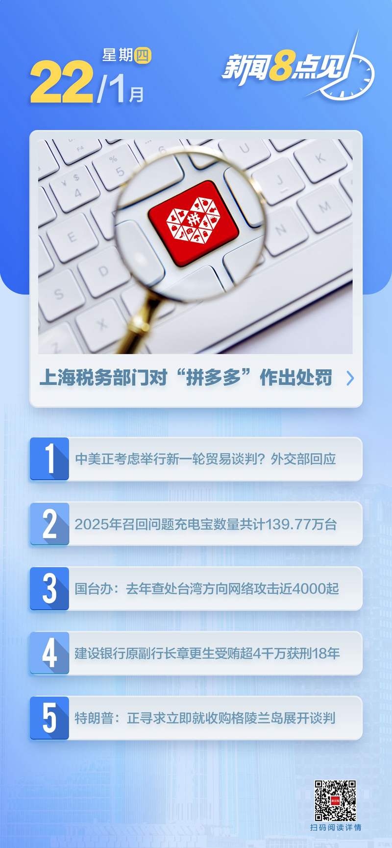 【时政】中美是否正在考虑新的贸易谈判?外交部回应称,外交部发言人郭家坤1月21日组织例行记者会。 彭博社记者:第一个问题,美国贸易代表格里尔昨天在达沃斯表示,美中可能举行新的贸易谈判。他表示,他们可以先会面,然后尝试就非敏感贸易问题达成一些额外协议。中美是否正在考虑新的贸易谈判?如果是的话,会在哪里举行?第二个问题:中方是否会批准英国驻华使馆改建计划?第三个问题是英国首相斯塔默本月是否会访问北京。郭家琨先生:关于第一个问题,如果您有具体疑问,建议您向中国有关主管部门咨询。中美双方应共同落实好两国达成的重要协议为中美经贸合作和世界经济注入更多稳定性和确定性。关于第二个问题,中方一直根据《维也纳外交关系公约》及相关立法的规定,正在办理英国驻华使馆规划申请。目前没有关于您所概述的具体访问的信息。当前国际形势动荡不安。作为安理会常任理事国,中英加强交流与合作绝对符合两国和世界的利益。 (外交部)阅读全文>>> 特朗普总统表示,联合国不应继续存在,但可以由“和平委员会”取而代之。外交部对此作出回应。 1月21日,外交部发言人郭家坤举行例行记者会。有记者问及特朗普总统的表态联合国应该继续存在,但可以由“和平委员会”取代。对此,郭家琨表示,关于“和委会”,中方昨天已就相关问题作出回应。对于联合国,中国始终践行真正的多边主义。无论国际风云如何变化,中国都将坚定维护以联合国为核心的国际体系,坚定维护以国际法为基础的国际秩序,坚定维护以《联合国宪章》宗旨和原则为基础的国际关系基本准则。 (央视新闻)阅读全文>>> 国务院台办:去年台湾发生近4000起网络攻击事件,已查处解决。 1月21日,国台办举行例行记者会。记者提问:民进党官员近日发表所谓“报告”,声称大陆将于2025年对岛上关键基础设施发动“全面网络攻击”。对此有何评论?发言人彭清源表示,民进党当局为了追求政治利益,不惜散布不实谣言,污蔑污蔑大陆,掩盖执政无能,转移民众对民进党的不满,升级两岸矛盾。事实上,民进党当局经常指示军事情报机构和网络单位对大陆进行网络攻击和破坏,传播非法有害信息。据统计,2025年有关部门共调查和应对来自台湾的网络攻击约4000起,较2021年增加25%。他们的行动集中在中国大陆的交通、金融、科技、能源等重点行业实施攻击和窃取机密。 P的所谓“报告”公安机关严厉谴责转移投资犯罪行为。黑色和白色。 (央视新闻)阅读全文>>>上海税务局依法对“拼多多”进行处罚,对“拼多多”处以10万元罚款。 1月21日,记者从国家税务总局上海长宁区税务局获悉,“拼多多”平台主要运营方上海福盟信息科技有限公司因未按照《互联网平台企业报送税务信息规定》规定报送涉税信息,已收到税务机关及时责令改正的通知。尽管该公司已进行整改,但未能在规定期限内完成,故该局决定依法对拼多多处以10万元罚款。 (新华社)阅读全文>>> 2025年召回139.77万块缺陷手机电池 发布会上21日,在国家市场监管总局召开的会议上,记者获悉,国家市场监管总局加大了对缺陷手机电池的召回力度,督促移动电源生产企业2025年分10次召回共计139.77万只。(新华社)阅读全文ta>>>陈东荣获“一级航天功绩奖章”。陈忠瑞先生、王杰先生荣获“航天三等功勋章”。神舟二十号载人飞行任务的圆满成功,凝聚了全军一大批科技人员、航天员、干部职工、指战员的智慧和心血。陈东同志、陈忠瑞同志、王杰同志是优秀代表。他们为党和国家献身,临危不惧,团结奋进,向世界展示了中国的坚强志向、中国的脊梁、中国的坚强意志。希娜的自信。陈东同志执行了3次载人飞行任务,共完成6次出舱活动,成为第一位在轨停留超过400天的中国航天员。陈忠瑞同志意志坚定、勇敢,敢于担当重任,办事细心、细致。它在首次飞行期间成功完成了三次太空行走。王杰同志训练有素,吃苦耐劳,很荣幸入选神舟二十号机组成员,并成功执行任务。为表彰他们在建设我国载人航天事业中取得的突出成就,中共中央、国务院、中央军委决定授予陈东同志“一等航天功勋奖章”,授予陈忠瑞同志、王杰同志“航天英雄”荣誉称号,授予他们“三等航天功勋奖章”。(新华社)阅读全文>>>五司:将在武汉天河国际机场等41个口岸新设免税店。财政部等五部门1月21日发布关于口岸免税店有关事项的通知,宣布在武汉天河国际机场等41个口岸新设免税店。(财政部)阅读全文>>>张中国建设银行原副行长张根生因受贿4064万余元一审被判有期徒刑18年 2026年1月21日,山东省淄博市中级人民法院以受贿罪、非法支出罪一审公开判处中国建设银行原党委委员、副行长张根生有期徒刑18年。根生被判处有期徒刑13年和罚款。因受贿罪400万元,被判处有期徒刑10年,并处罚金10万元。被判处有期徒刑18年,并处罚金10万元。 410万元人民币。张根生通过受贿取得的资产和利益将依法追缴上缴国库,赤字部分继续追缴。经审理,发现其非法收受财产共计4064万余元。 (央视新闻)阅读全文>>> 【本地】北京经济总量突破5万亿元。 1月21日,北京发布年度经济运行情况。根据地区生产总值统一测算结果,预计2025年北京地区生产总值按可比价格计算将达到520734万元,比上年增长5.4%。北京经济总量突破5万亿元。 (新京报)阅读全文>>>北京西站将